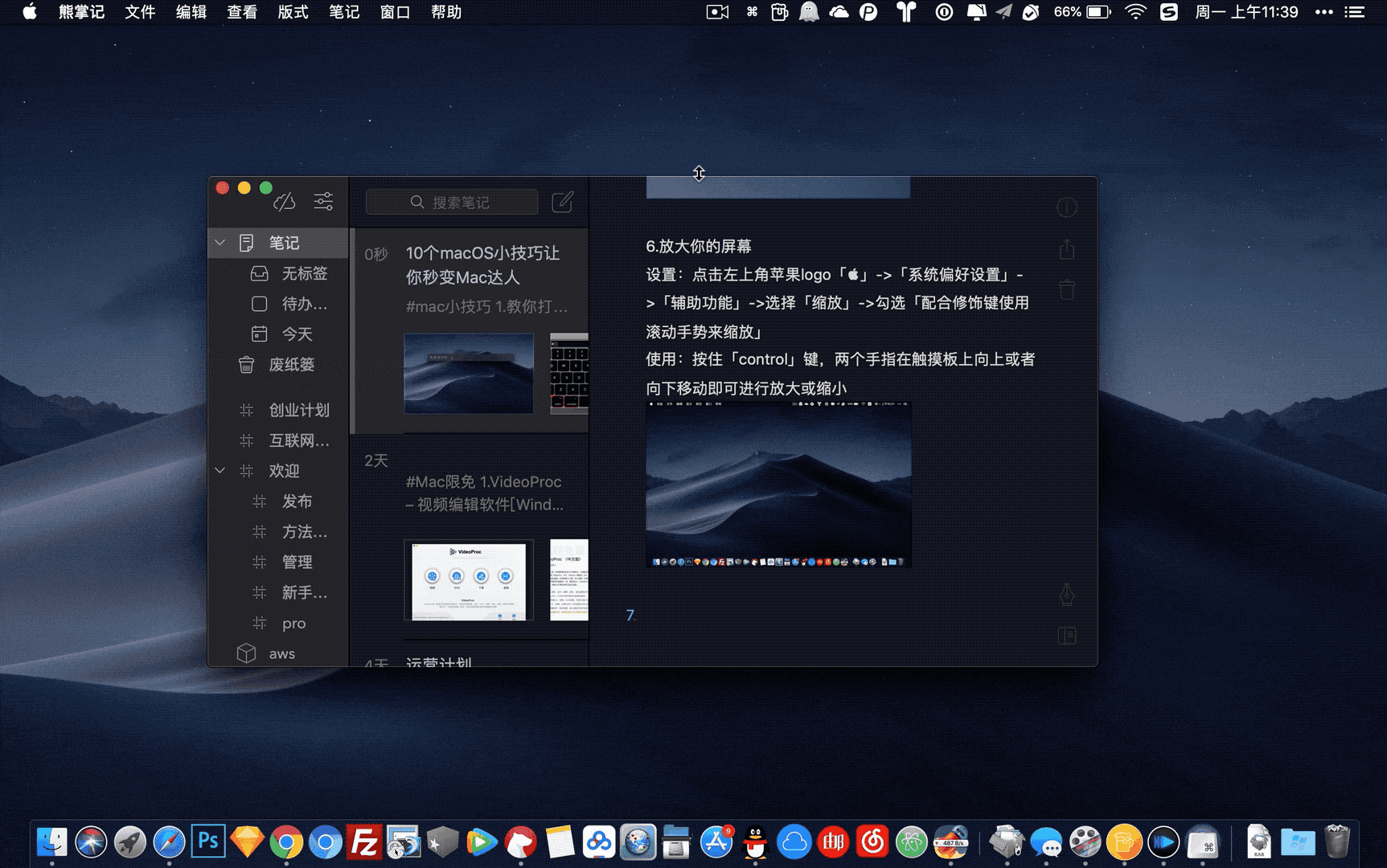设置:点击左上角苹果logo「」->「系统偏好设置」->「辅助功能」->选择「缩放」->勾选「配合修饰键使用滚动手势来缩放」