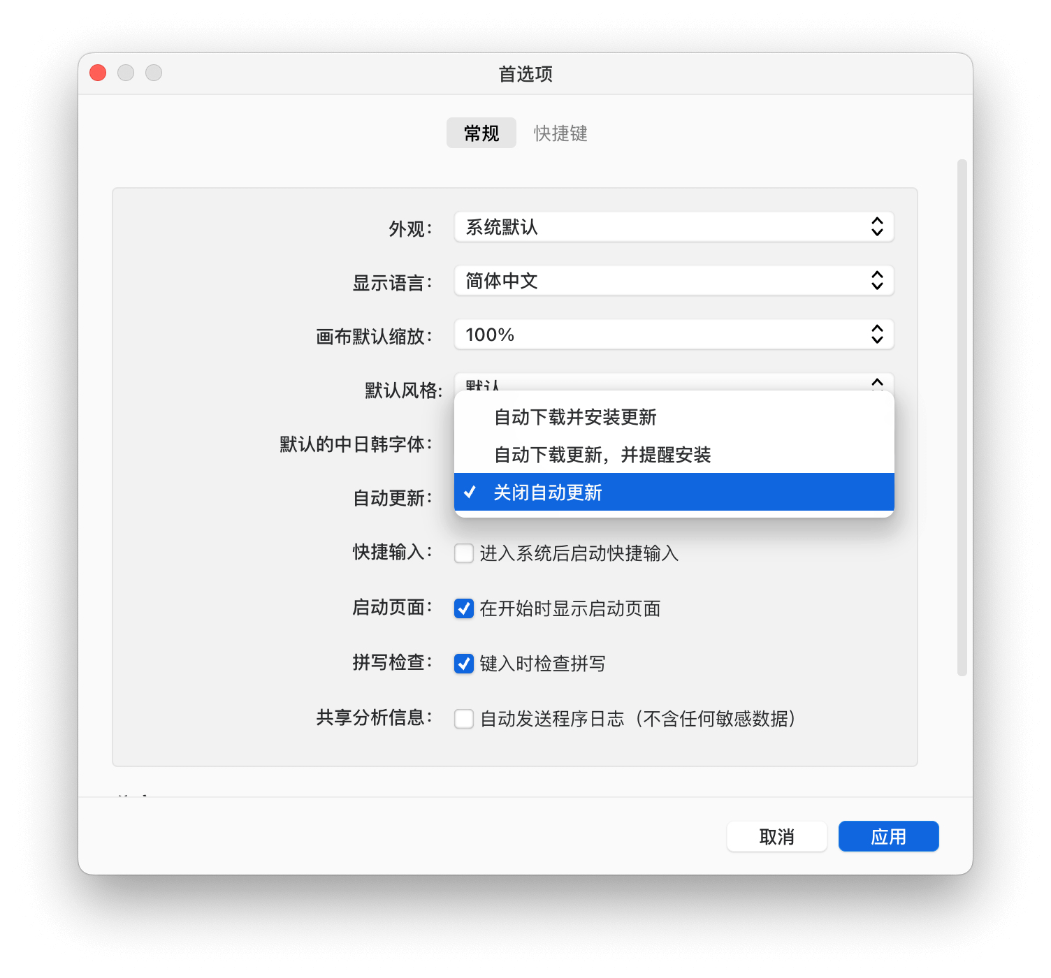 如果下载后,软件自动更新,请去软件首选项中关闭自动更新。如果已经自动下载好更新,请不要点击「重启程序以安装」,直接将此对话框关闭即可。