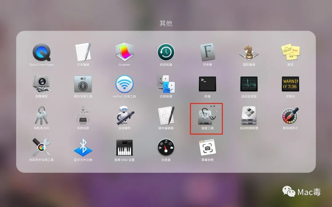 1、打开启动台,在「其他」中找到系统自带的「磁盘工具」并打开