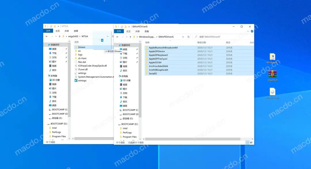 2. 解压 WTG 辅助工具到桌面得到文件夹 wtga5420,将 WindowsSupport 中目录下的所有文件夹复制到 wtga5420 文件夹中 WTGA 目录下的 Drivers 文件夹中。