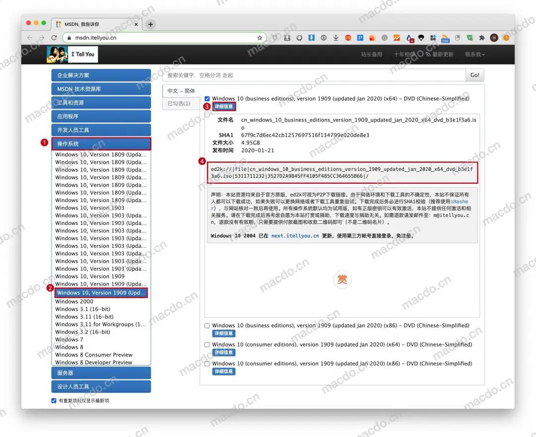 2. 进入网站 msdn,选择「操作系统」,找到 Win10 最新版,点击「详细信息」,复制链接地址到迅雷下载。