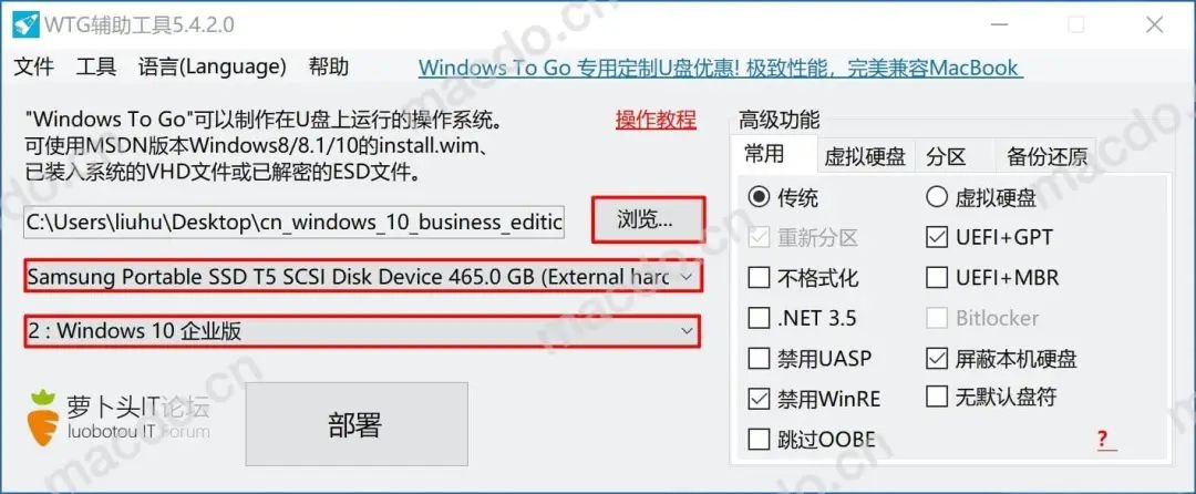 4. 「浏览」选择 Win10 系统镜像,然后选择插入的移动硬盘,系统选择 Windows10 企业版,最后选择「部署」。出现警告提示,选择「是」。写入完成即可关闭辅助工具。