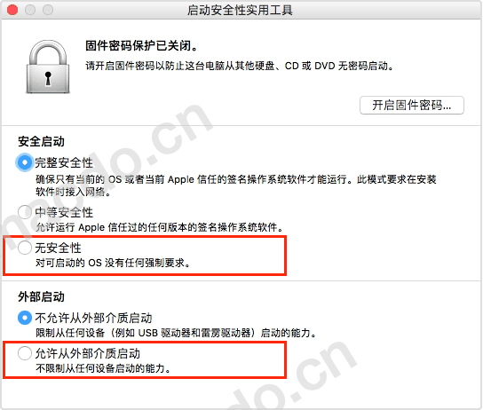 - 然后将安全启动调整为「无安全性」,并允许从外部启动