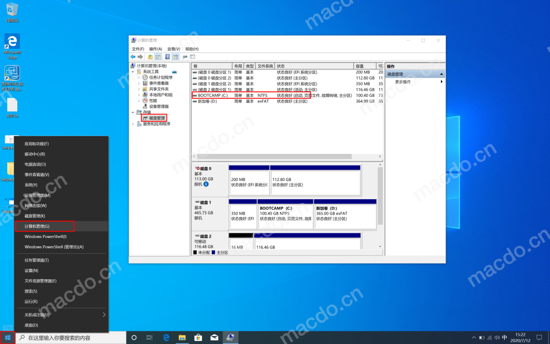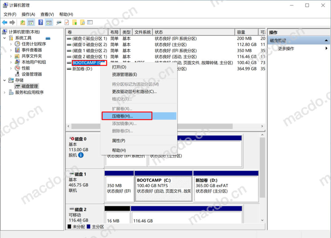 2. 选择「BOOTCAMP(C:)」,右键选择「压缩卷」,输入压缩空间量并确定。