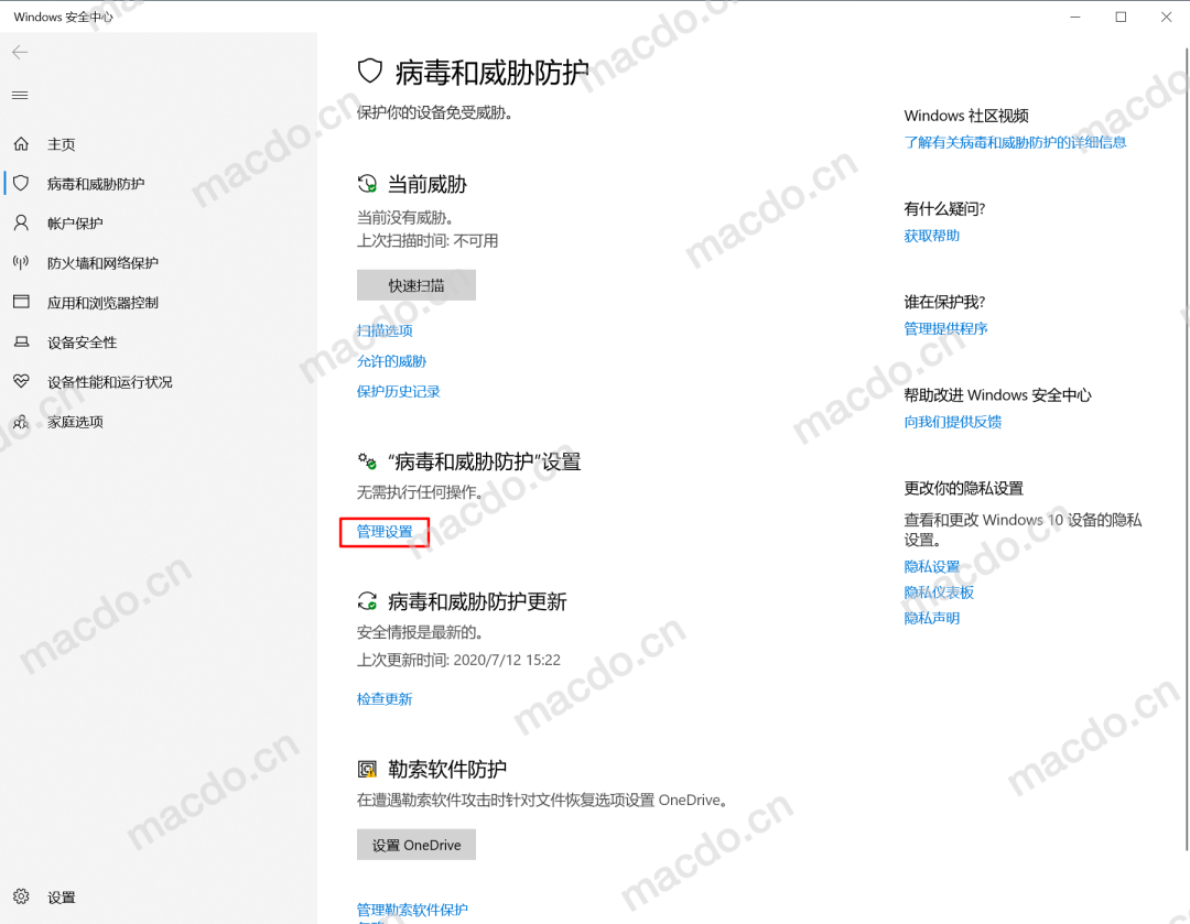 2. 点击病毒和威胁防护的下方的「管理设置」