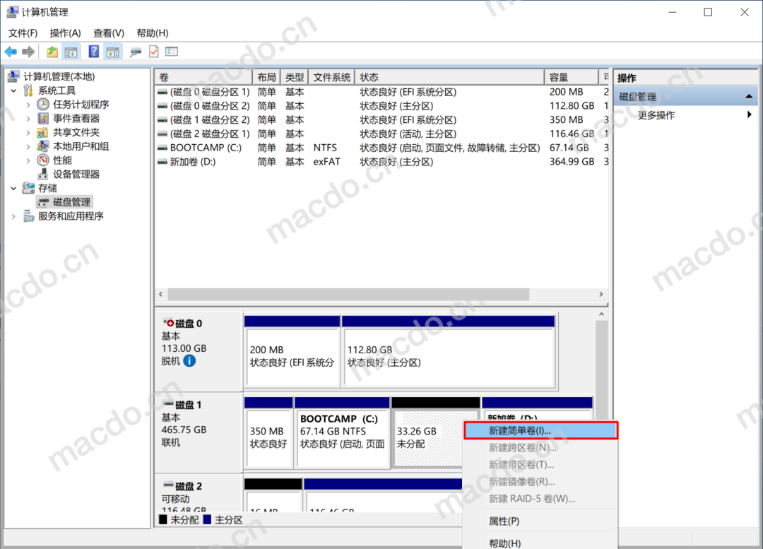 3. 找到刚刚压缩的「未分配」的分区,右键选择「新建简单卷…」。