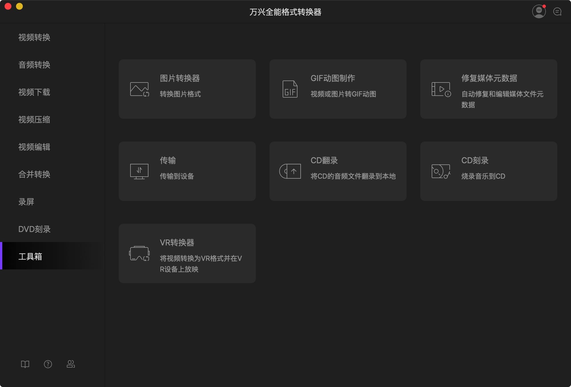 Wondershare UniConverter for Mac 是一款全能的视频转换工具。它的中文名字叫做万兴全能格式转换器,虽然名字叫转换器,但是它的功能却不限于视频格式转换,还包括在线视频下载(支持youtube等1000多个在线视频网站,不过基本上只支持国外的)、光盘刻录、传输文件到iOS设备(iPhone,iPad,iPod Touch)。还有一个强大的工具箱,里面包含:图片格式转换器、视频/图片转GIF、编辑修复媒体Meta元数据、无损压缩视频、视频转VR格式、CD烧录器、IOS/DVD光盘复制、CD翻录、屏幕录像、投放视频到电视。功能非常强大,是一款必备软件。