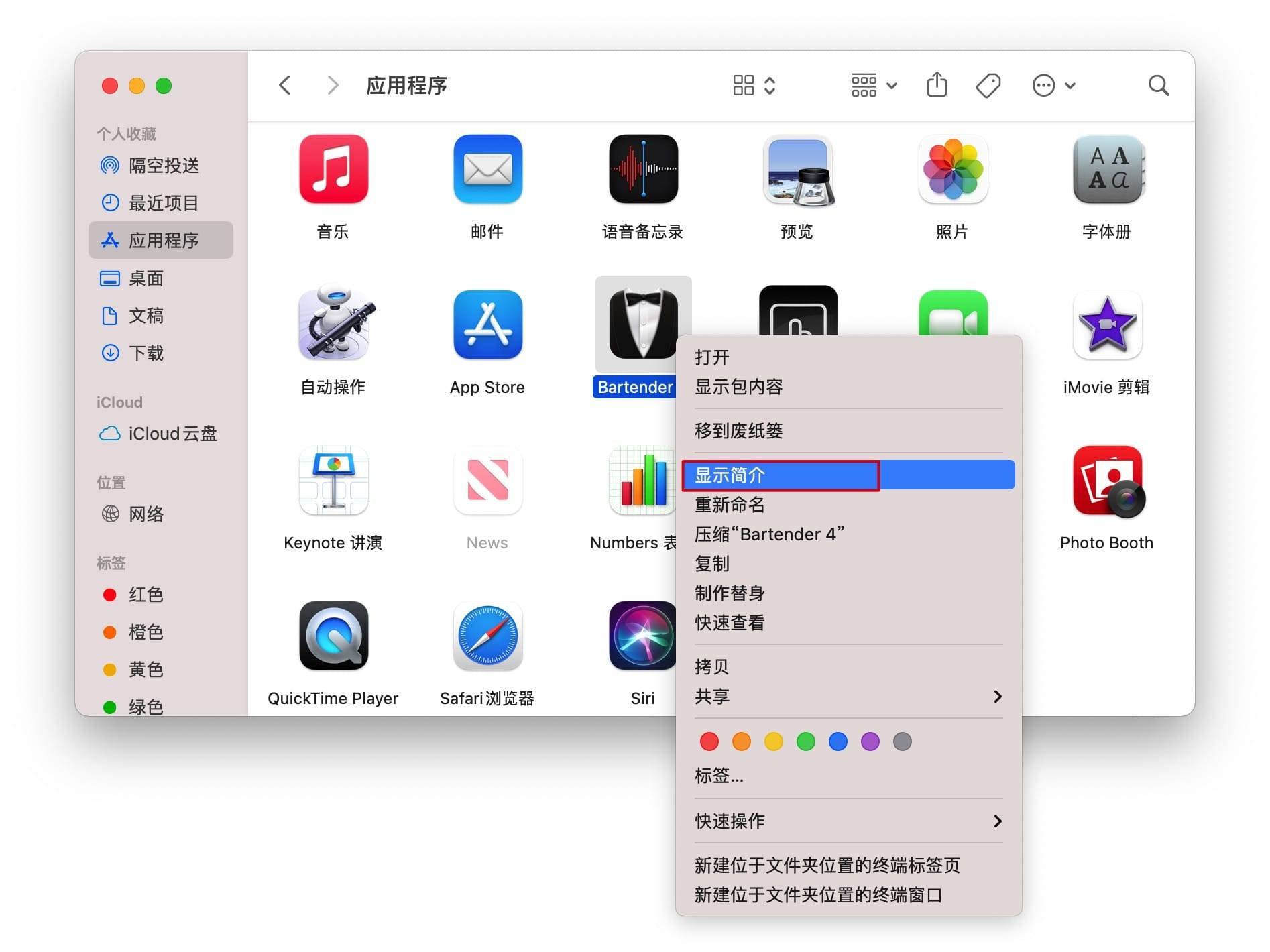 - 打开访达,进行应用程序目录,找到闪退的应用,在应用图标上右键,然后点击「显示简介」