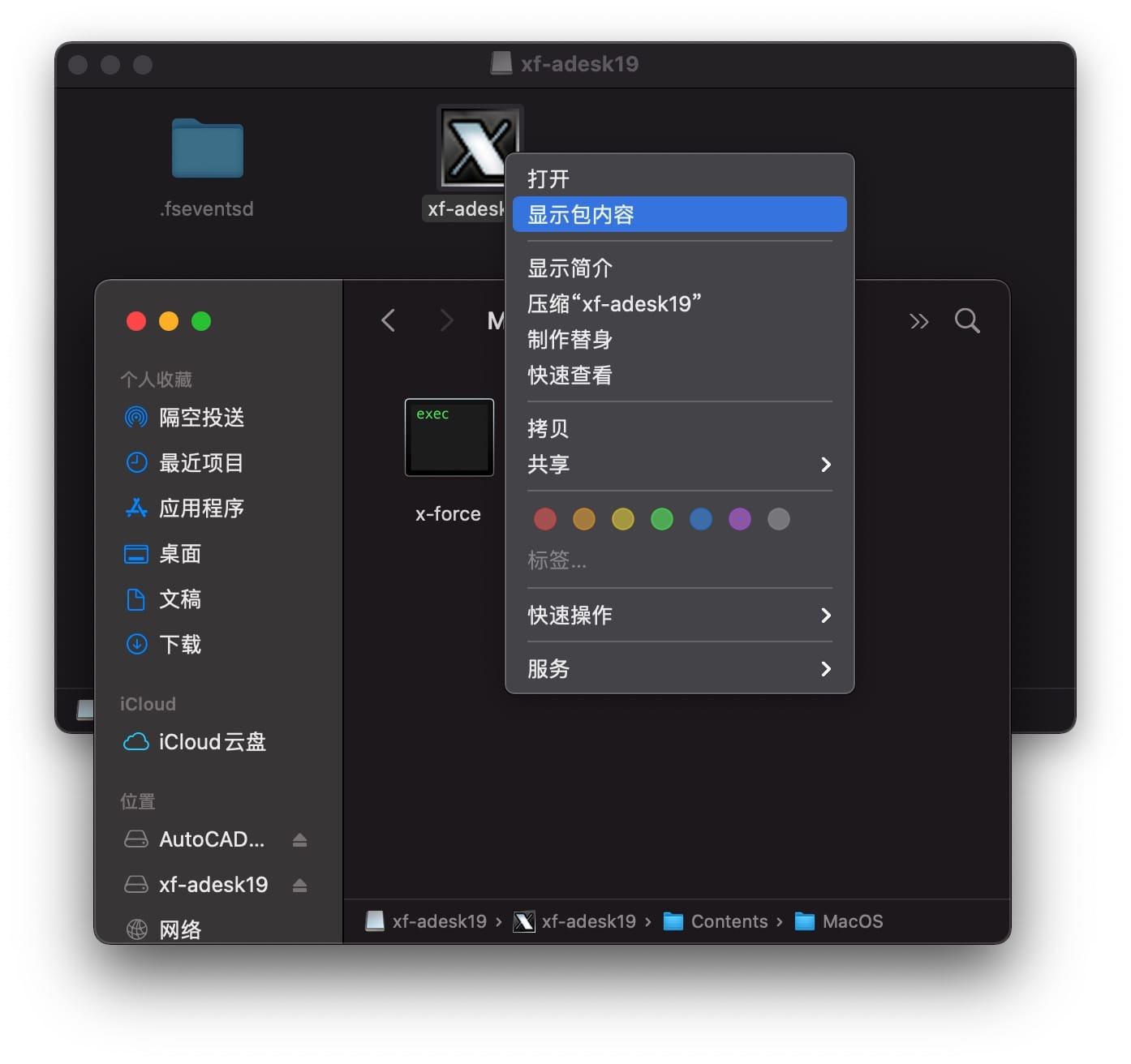 2. 将「xf-adesk19」注册机移动到「应用程序」中,并右键打开 xf-adesk19,选择『显示包内容』,进入目录 Contents - MacOS,你会看到 x-force 这个可执行文件。