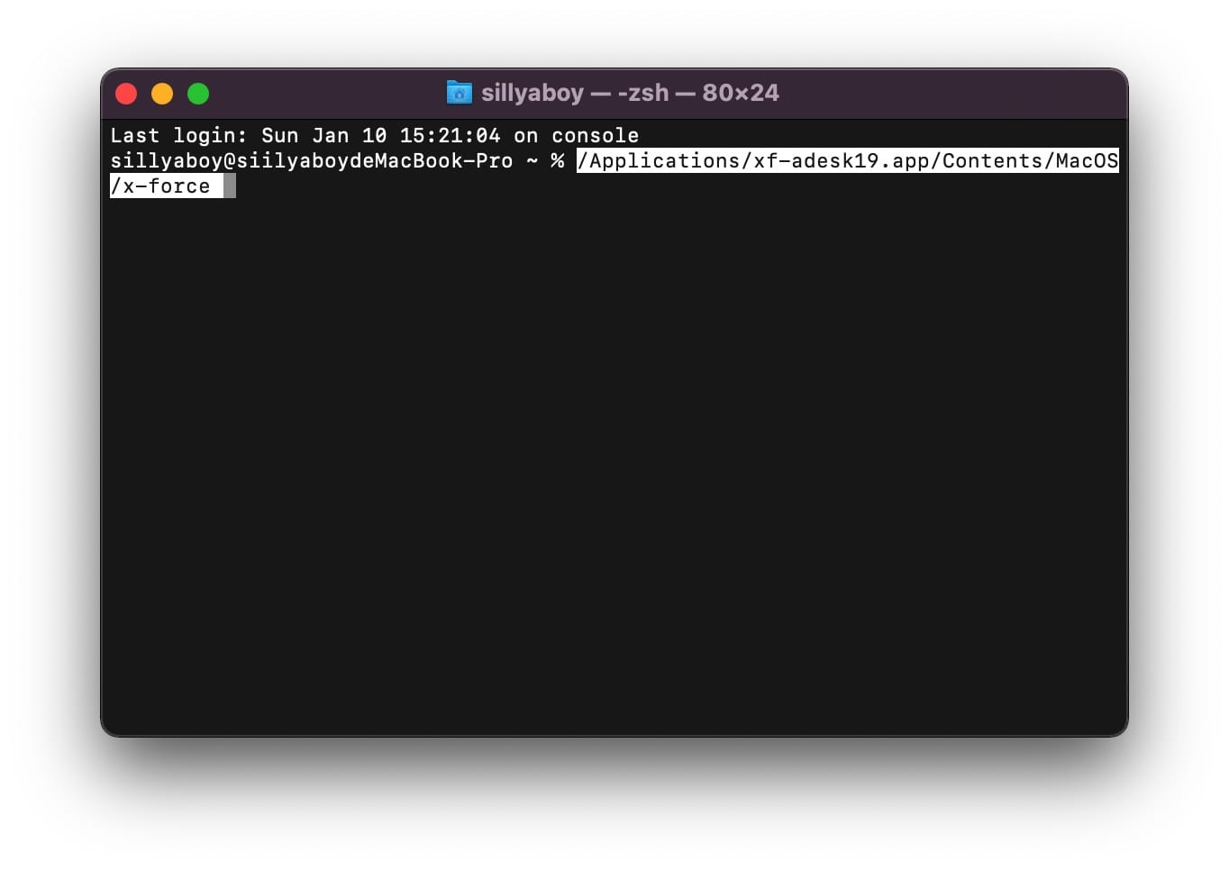 并再此命令后面输入可执行文件「x-force」的路径(将x-force拖入终端即可获取路径,如下图:)
