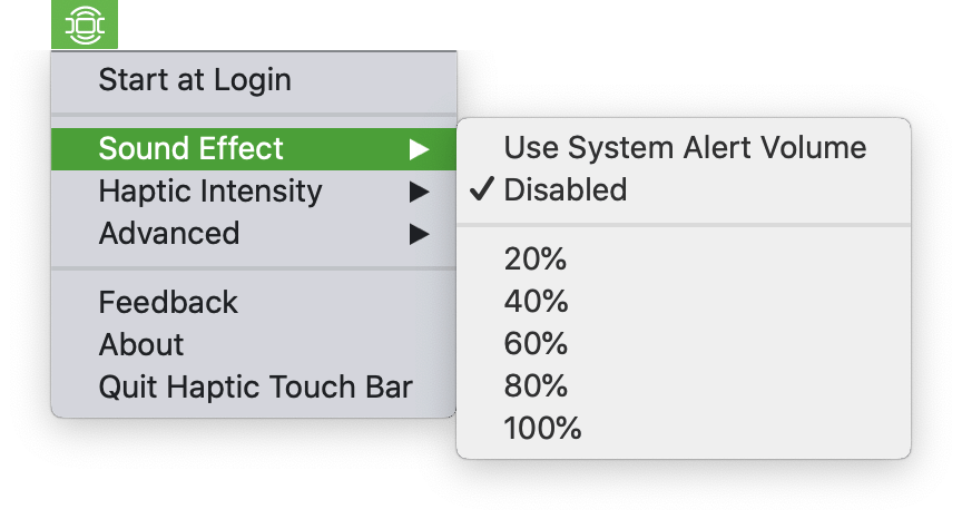 Haptic Touch Bar 支持自定义 Touch Bar 中虚拟按键的反馈强度,一共有四档可以选择,您可以根据需求自行调整到合适的震动强度级别。