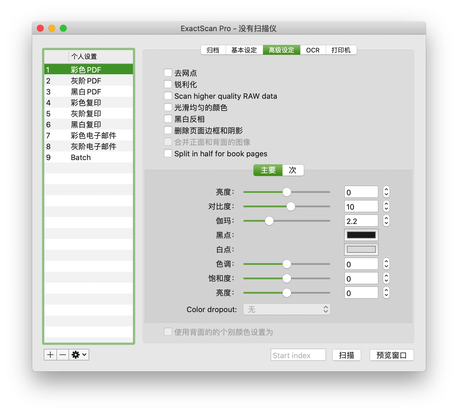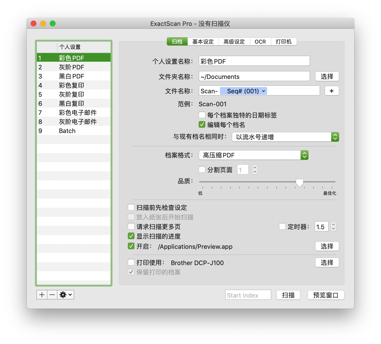 ExactScan Pro 是一种适用于Mac扫描仪驱动程序,支持500多种专业扫描仪。支持TWAIN,可以将不同的扫描仪与TWAIN驱动程序一起使用 。在ExactScan的帮助下实现无纸化。快速扫描,归档,排序,存档和查找您的文档。支持:纸张尺寸检测(自动裁切)、偏斜校正(去歪斜)、自动黑白优化、空白页检测、光学字符识别OCR(可搜索PDF)、自动旋转、全自动存储格式、简单的PDF编辑、高速扫描(每分可达100页)、批量处理、条形码识别、AppleScript脚本支持。支持的格式 PDF,TIFF,GIF,PCX,JPEG,JPEG-2000,BMP,PNG,PNM,RTF,HTML,TXT。