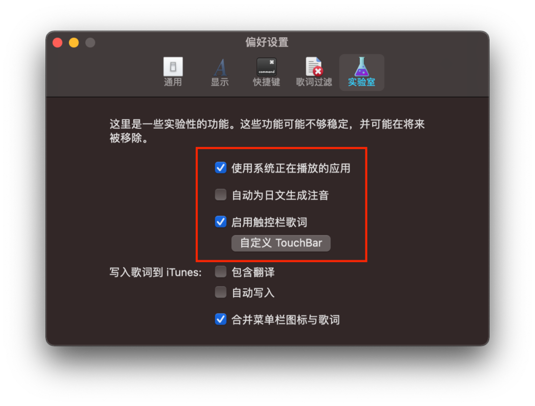 3、勾选「使用系统正在播放的应用」和「启用触控栏歌词」就完成了✅
