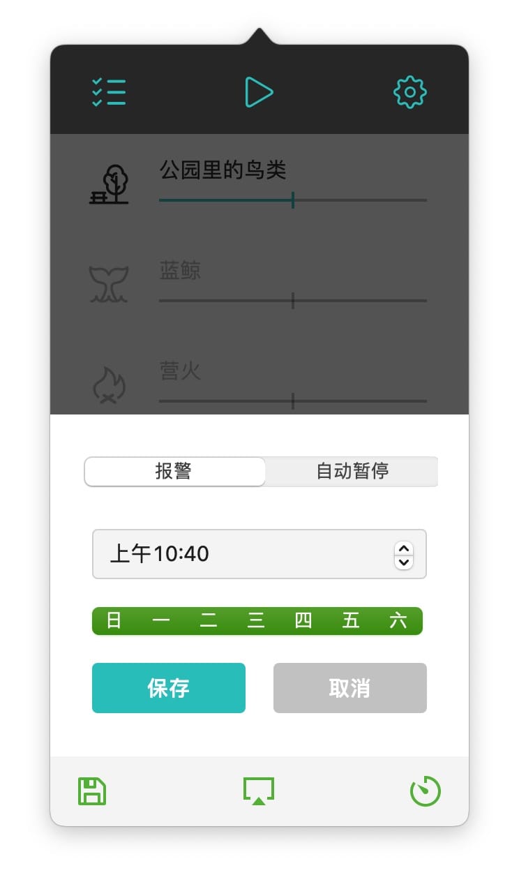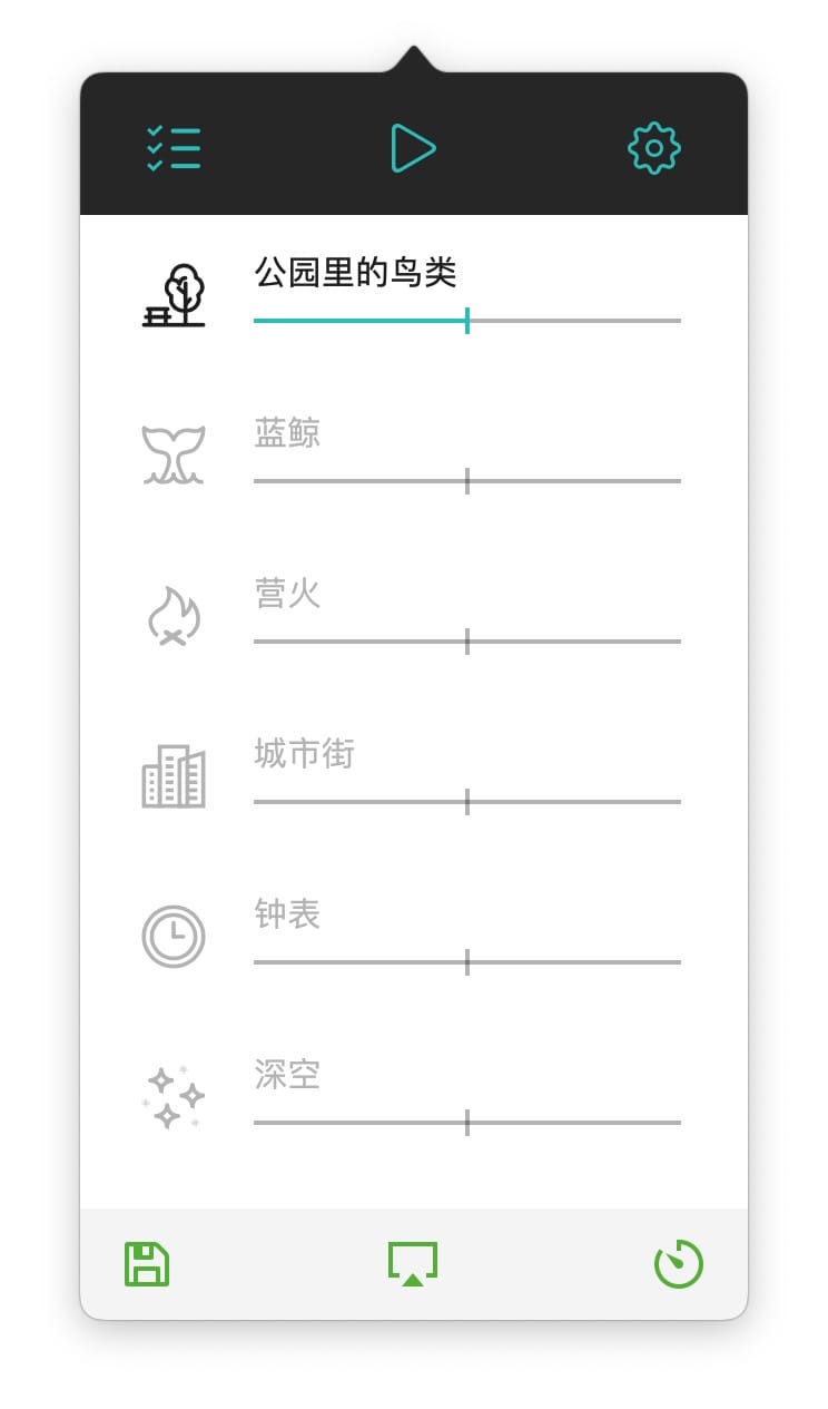 初次进入 Noizio,如果你直接点击最上方的播放键,什么声音也不会有。这里的交互其实不是非常直观,你需要点击一下你想要的声音前面的图标,由灰变黑后,这种声音才会被播放,同时可以调整音量大小。