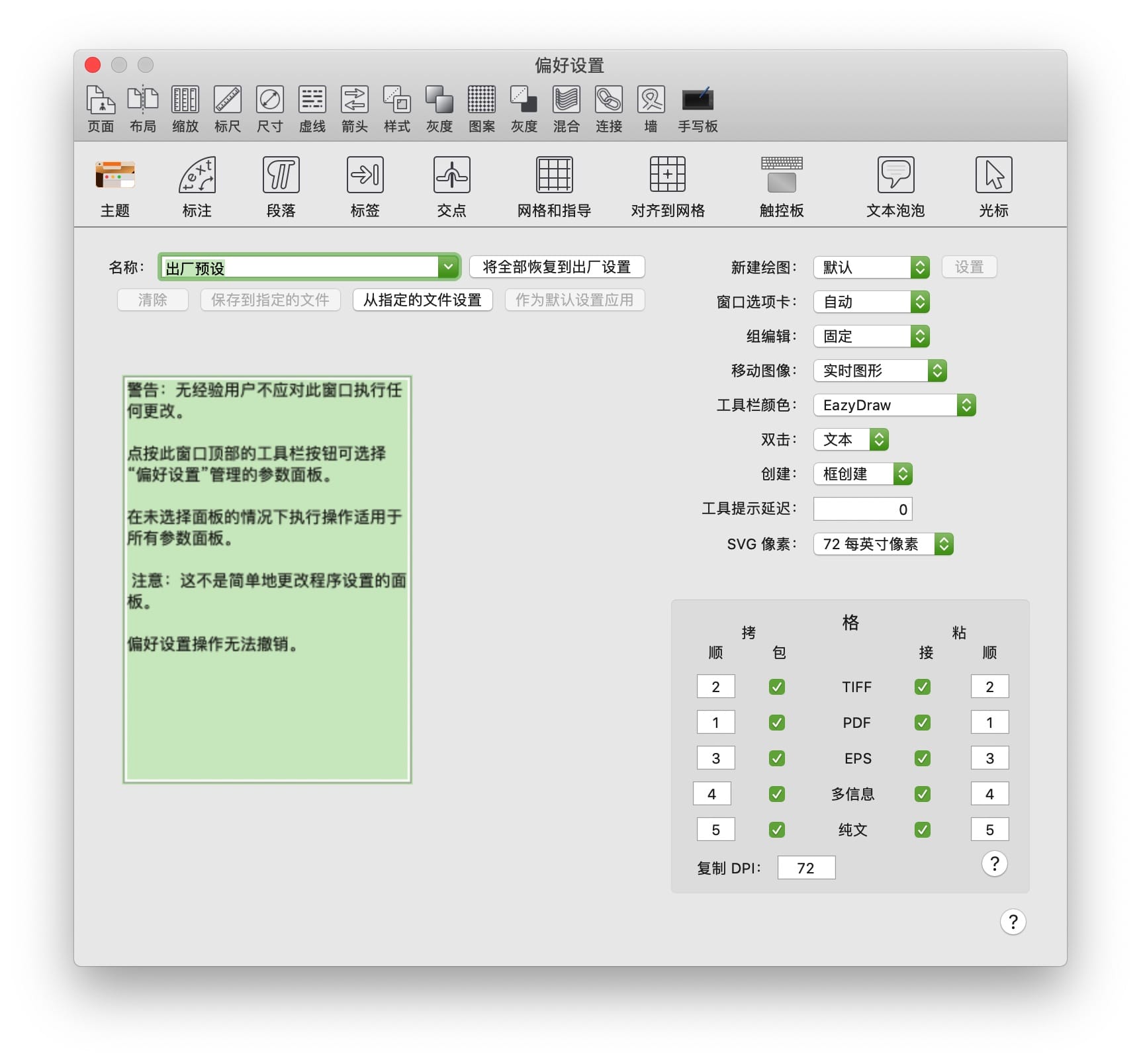 EazyDraw 是一款运行于macOS上的矢量图形绘制应用。全彩色管理,支持宽色域显示P3颜色。包括对位图和矢量图形格式的全面支持:导入和取消分组以编辑PDF和EPS。导入和导出SVG,以及现在的DXF。使用RGB或CMYK印刷色预览并发布到EPS和TIFF。使用DXF交换比例缩放的CAD工程图。预览和发布Web图形的全色域颜色。使用Display P3颜色创建macOS,iOS和watchOS应用开发图形界面。