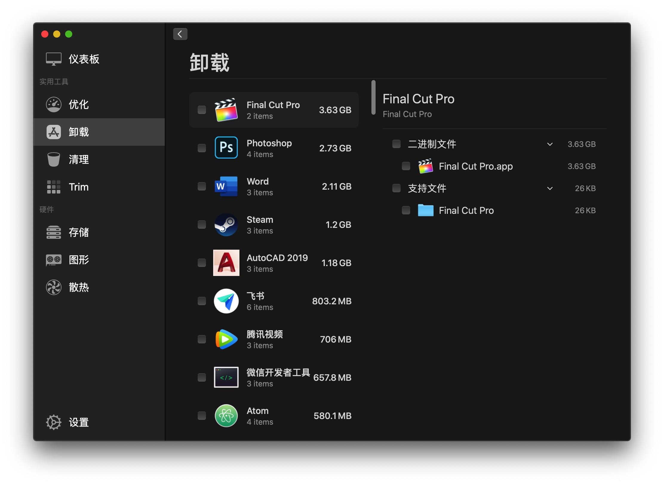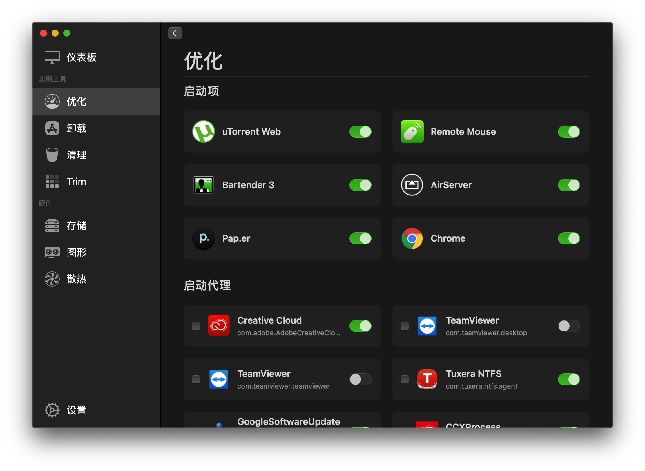 Sensei 是新一代的 Mac 优化清理以及系统性能检测工具。拥有带数据图表的仪表板,应用卸载,磁盘系统清理,启动项管理,电池健康管理(包含详细的电池报告),散热详细的硬件信息、图表及报告,温度监控模块(当前版本不支持)、GPU/显示器详细报告、性能优化、CPU监控、RAM内存监视、磁盘监视、风扇控制、磁盘基准、电池健康分析、启动速度优化、分区图管理等等功能。